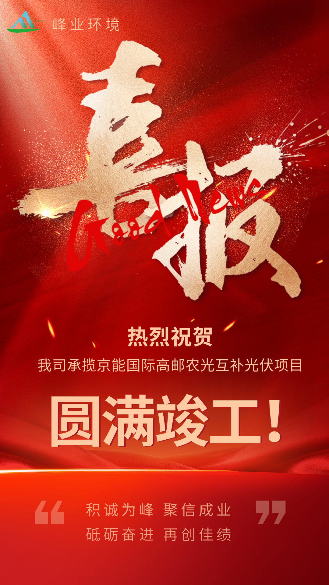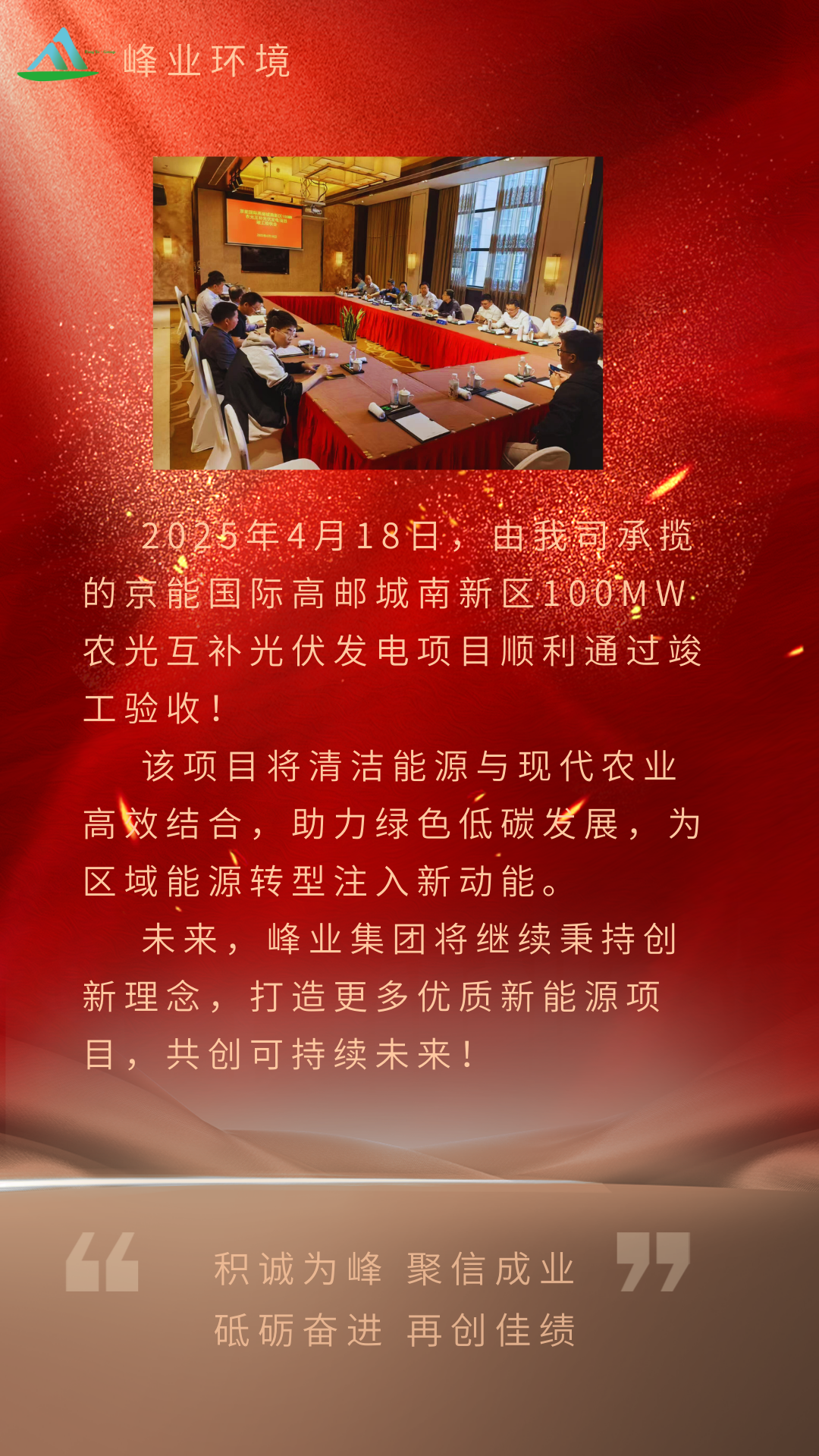 【熱烈祝賀】2025年4月18日,由我司承攬的京能國(guó)際高郵城南新區(qū)100MW農(nóng)光互補(bǔ)光伏發(fā)電項(xiàng)目順利通過(guò)竣工驗(yàn)收!該項(xiàng)目將清潔能源與現(xiàn)代農(nóng)業(yè)高效結(jié)合,助力綠色低碳發(fā)展,為區(qū)域能源轉(zhuǎn)型注入新動(dòng)能。未來(lái),峰業(yè)集團(tuán)將繼續(xù)秉持創(chuàng)新理念,打造更多優(yōu)質(zhì)新能源項(xiàng)目,共創(chuàng)可持續(xù)未來(lái)!